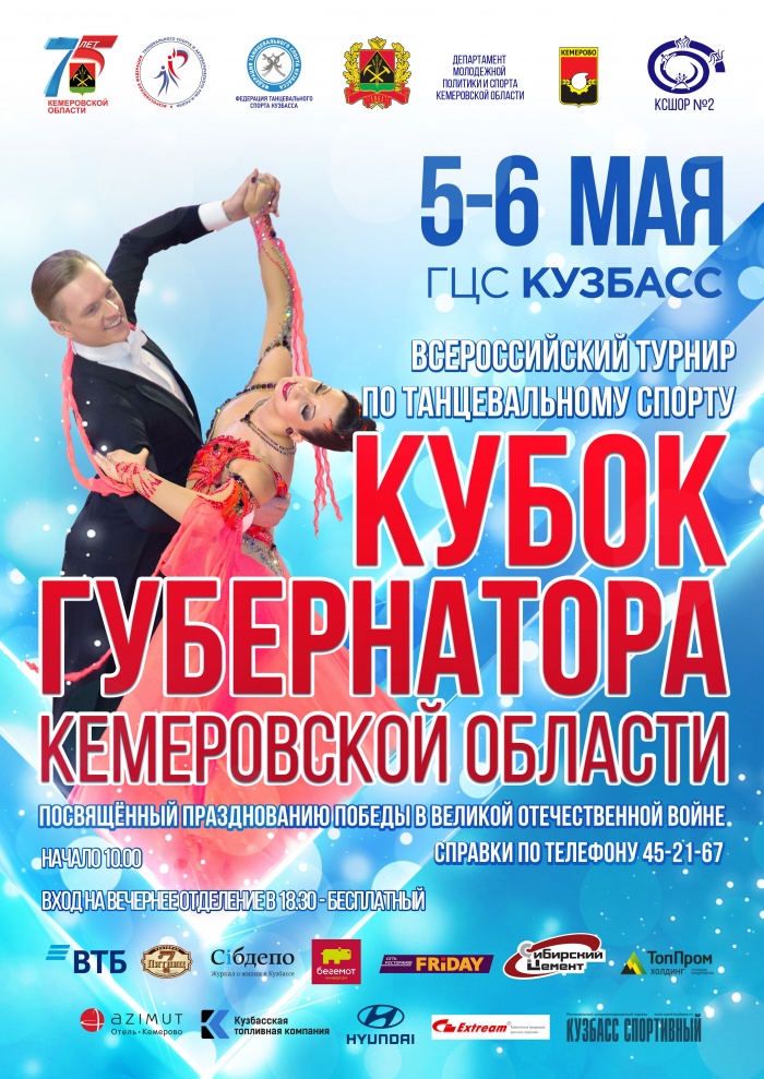 С 5 по 6 мая 2018 года в городе Кемерово в универсальном зале МАУ Губернский центр спорта «КУЗБАСС» (бульвар Строителей, 55) пройдет всероссийский турнир по танцевальному спорту «Кубок Губернатора Кемеровской области» по латиноамериканской и европейской программах танца, посвященный празднованию Победы в Великой Отечественной войне, 75-летия Кемеровской области.
