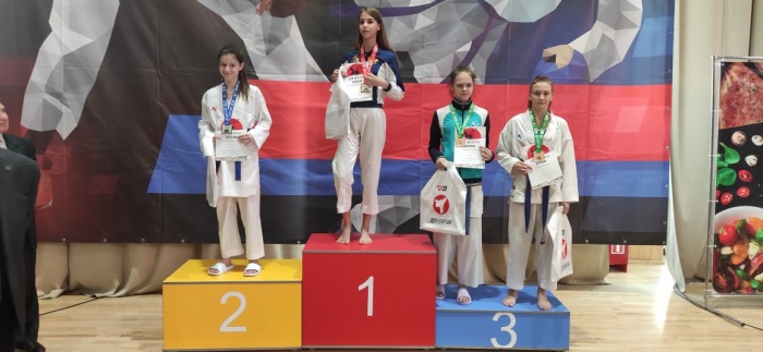 среди девушек 12-13 лет в в\к 55 кг в категории кумитэ: