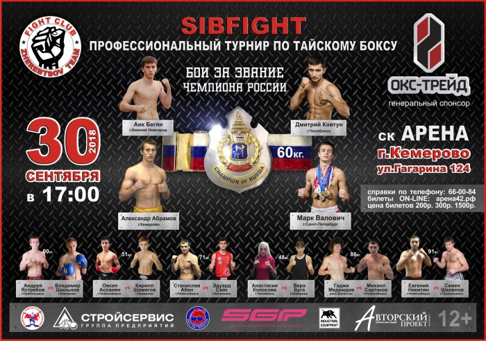 30 сентября в 17-00 спортивный комплекс «Арена» принимает профессиональный турнир по тайскому боксу «SibFight». На ринге сразятся сильнейшие российские тайбоксеры – чемпионы России, мира и Европы.