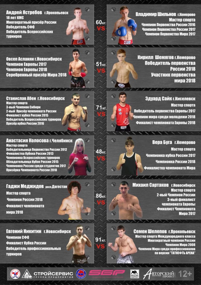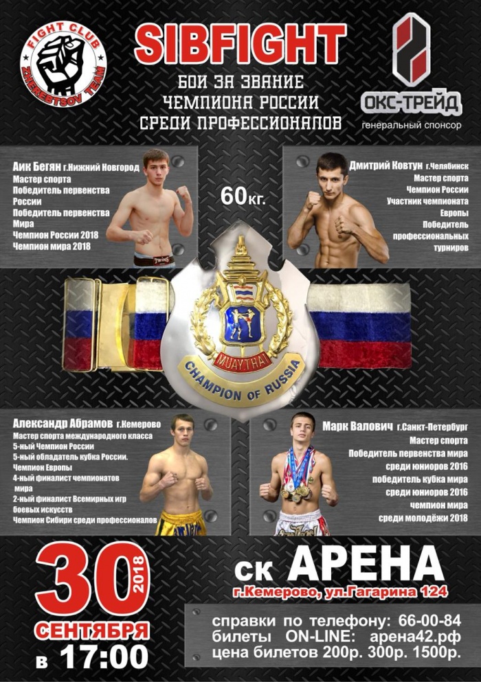 Главным событием вечера станет турнир-«четверка» в весовой категории 60 кг за пояс чемпиона России среди профессионалов. За трофей побьются: действующий чемпион мира Айк Бегян (г. Нижний Новгород), чемпион России Дмитрий Ковтун (г. Челябинск), чемпион Европы, финалист чемпионата мира, финалист Всемирных игр боевых искусств Александр Абрамов (г. Кемерово), чемпион мира среди молодежи Марк Валович (г. Санкт-Петербург).