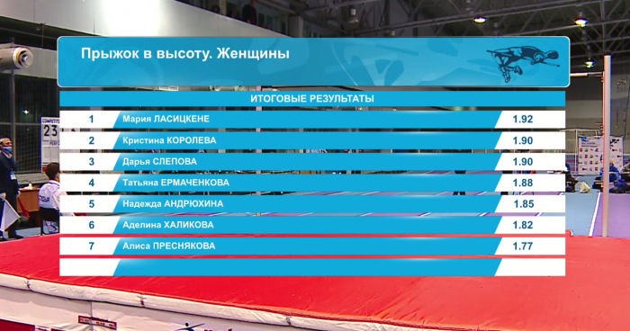 2 место среди женщин в прыжке в высоту с результатом 190 см заняла Королева Кристина (1990 г.р., МС России международного класса, г. Кемерово, тренер, заслуженный тренер России, Канашевич Анатолий Михайлович).