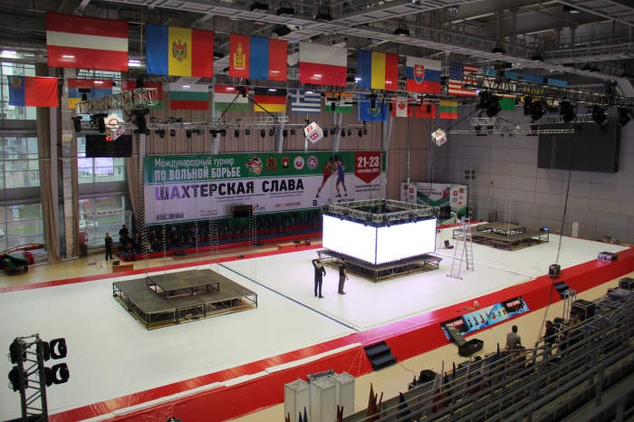 Накануне за неполные сутки в универсальном зале ГЦС «Кузбасс» собран помост для соревнований, а также смонтирована стойка для главного приза.