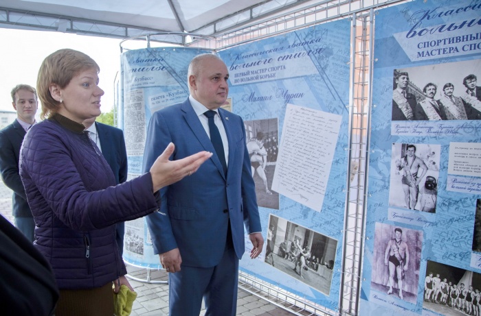 Губернатор посетил выставочный комплекс-шатер с мультимедийным оборудованием, установленный перед ГЦС «Кузбасс». Здесь любой желающий смог ознакомиться с историей проведения крупнейших состязаний по вольной борьбе в Кузбассе.