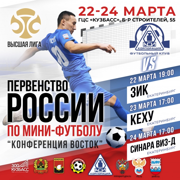 С 22 по 24 марта в Кемерове в ГЦС «Кузбасс» пройдет 9 тур первенства России по мини-футболу среди команд «Высшей лиги» (конференция «Восток»).
