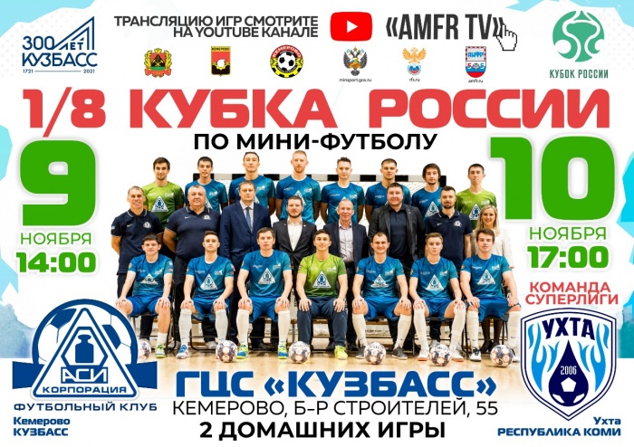 9 и 10 ноября в ГЦС «Кузбасс» состоятся матчи в рамках 1/8 финала Кубка России по мини-футболу. Впервые в Кемерово приедет мини-футбольная команда Суперлиги «Ухта» из Республики Коми.
