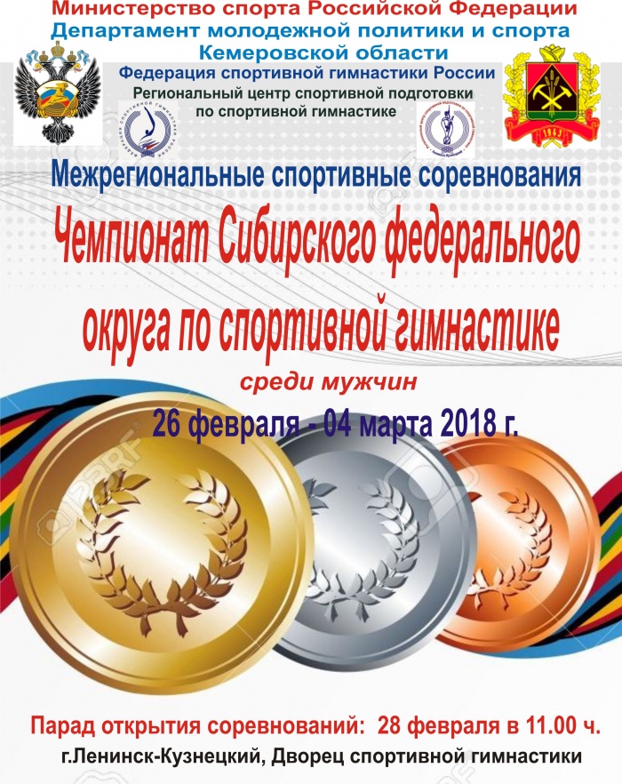 С 26 февраля по 4 марта 2018 года в городе Ленинске-Кузнецком, в «Региональном центре спортивной подготовки по спортивной гимнастике» (проспект Ленина, 2а) состоятся межрегиональные спортивные соревнования – чемпионат Сибирского федерального округа по спортивной гимнастике среди мужчин.