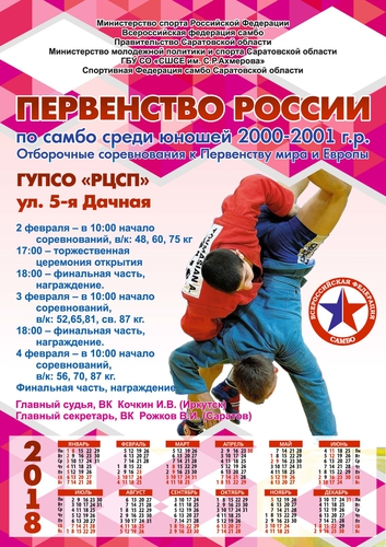 С 1 по 5 февраля 2018 года в городе Саратов на первенстве России по самбо среди юношей 2000-2001 года рождения успешно выступили спортсмены Кемеровской области.
