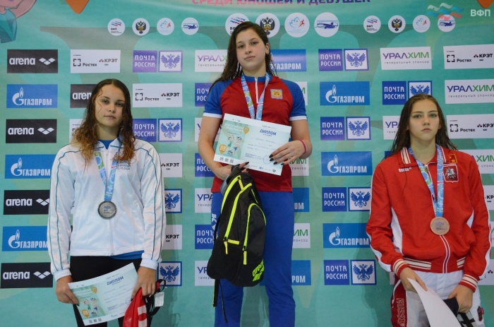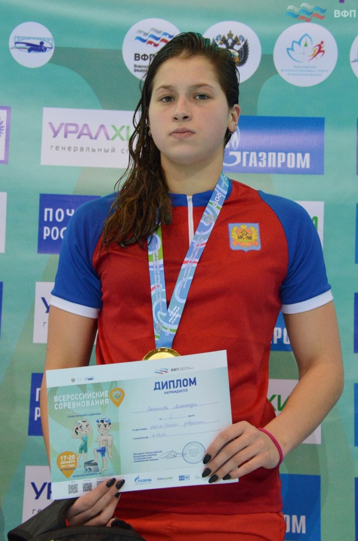 Мастер спорта России Александра Сабитова выиграла золотые медали на дистанции 200 м баттерфляем с результатом 2.09,24 (рекорд соревнований), на дистанции 100 м баттерфляем с результатом 57,77 и на дистанции 50 м баттерфляем с результатом 26,61. Тренирует спортсменку Елена Поданева.