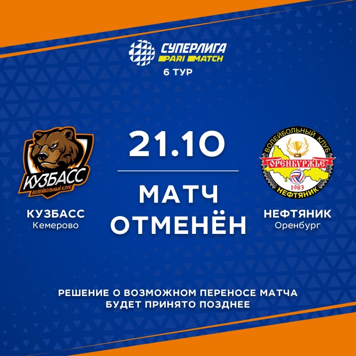 Пресс-служба волейбольного клуба «Кузбасс» сообщила об отмене матча с оренбургским «Нефтяником», запланированным на 21 октября в городе Кемерово.
