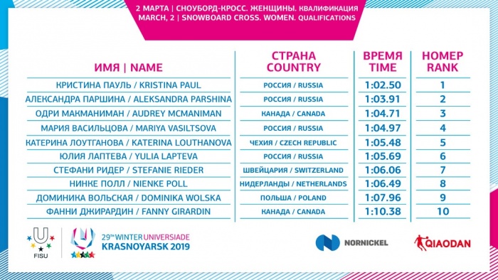 Сегодня, 2 марта 2019 года на кластере «Сопка» состоялись заезды по сноуборд-кроссу (квалификация), где успешно приняли участие кузбасские спортсмены Андрей Анисимов, Юлия Лаптева и Кристина Пауль. Полуфиналы и финал состоятся завтра, 3 марта, в 15:30 по местному времени.
