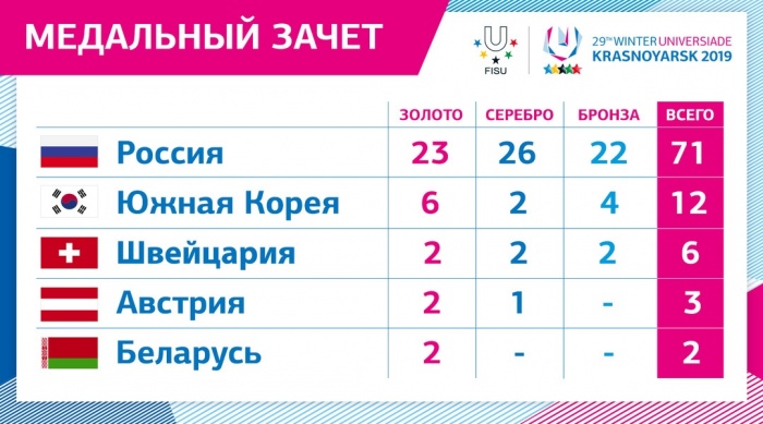7 марта Российская сборная продолжает наращивать отрыв от преследователей в медальном зачете, сегодня общее количество медалей пополнилось до 71, 23 из которых золотые. На втором месте по-прежнему сборная Кореи, общее количество медалей – 12, шесть из которых золотые.